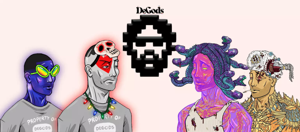 DeGods is a deflationary 10k PFP collection of gods dressed in a unique style of the current fashion that meets old deity vibes, with a focus on community usefulness.