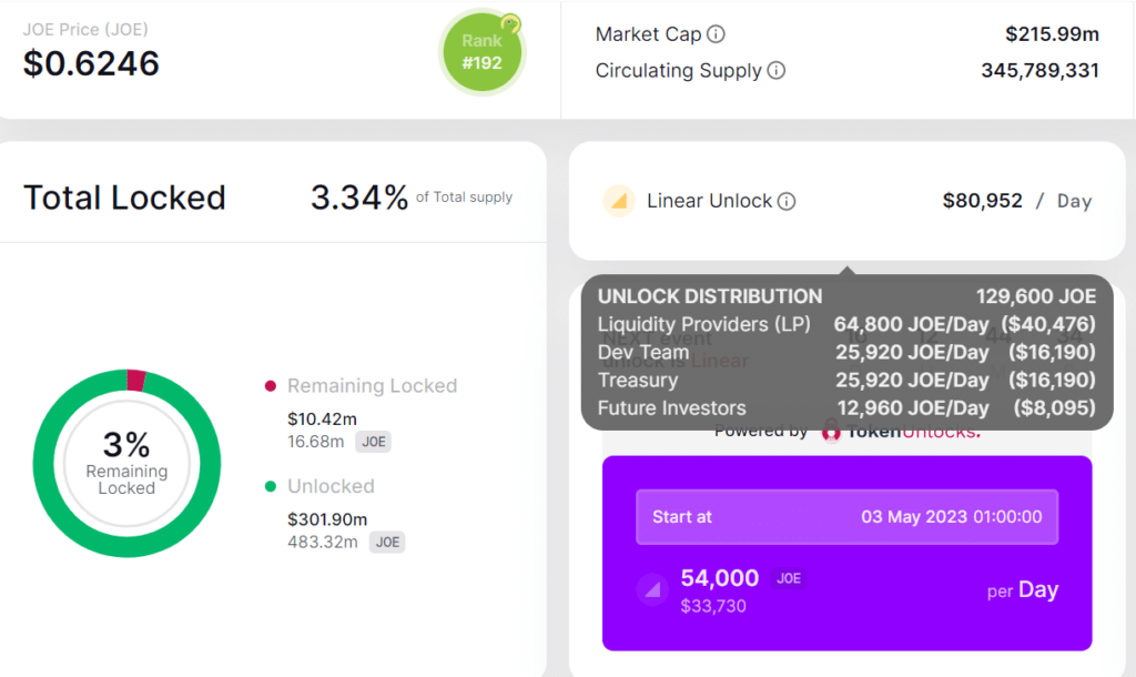 Specifically, there will be a daily unlock of 54,000 JOE, translating to over $33,000. As of this writing, there were over 483 million JOE tokens in circulation, valued at more than $301 million.