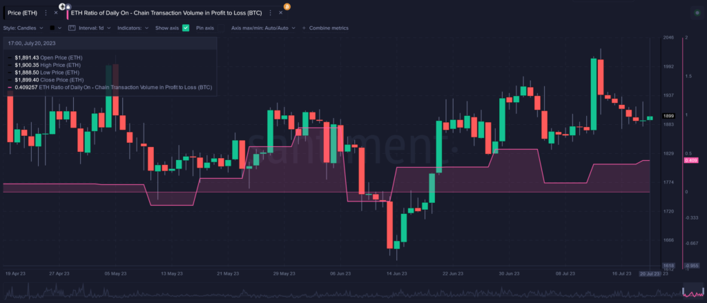 Santiment’s director of marketing Brian Quinlivan says that one of the metrics suggesting an upward move for Ethereum is the crypto asset’s profit-to-loss ratio of on-chain transactions.