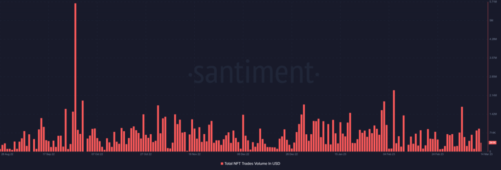 Likewise, DOT’s volume on Santiment has been typical, with no noticeable spikes. This volume is similar to the NFT volume. Nonetheless, the volume has picked up and has been on an uptrend after a fall seen on March 12. The volume was already over 369 million, at the time of writing.