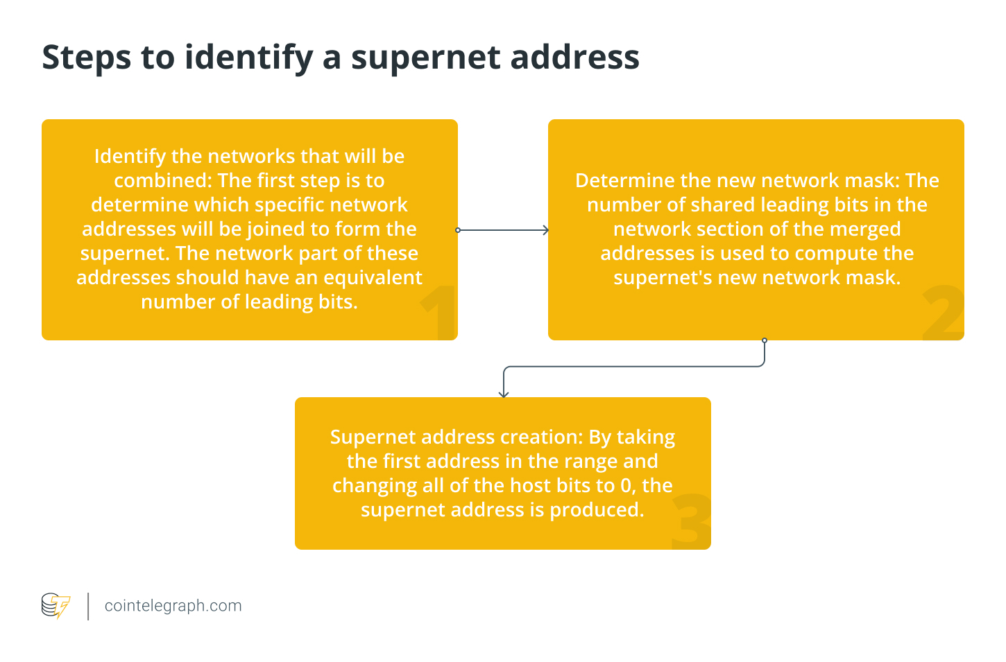 This supernet can be used in place of the two individual networks, and any IP address within the range of the supernet will be routed to the correct destination network. Supernetting helps to reduce the number of routes in the routing table, making it easier for routers to manage network traffic and improving the efficiency of IP address usage. However, it is important to note that the process of supernetting requires a good understanding of internet protocol (IP) addressing and network subnetting.