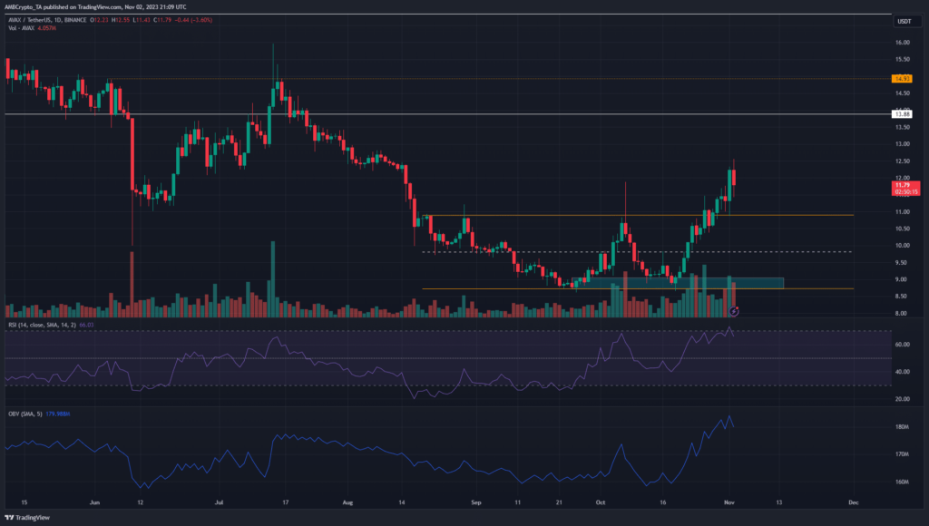 The breakout occurred on high trading volume. Additionally, the $11 and $11.6 were retested as support in the lower timeframes. This indicated that AVAX was likely to advance to the next major resistance at $13.9 and possibly higher.