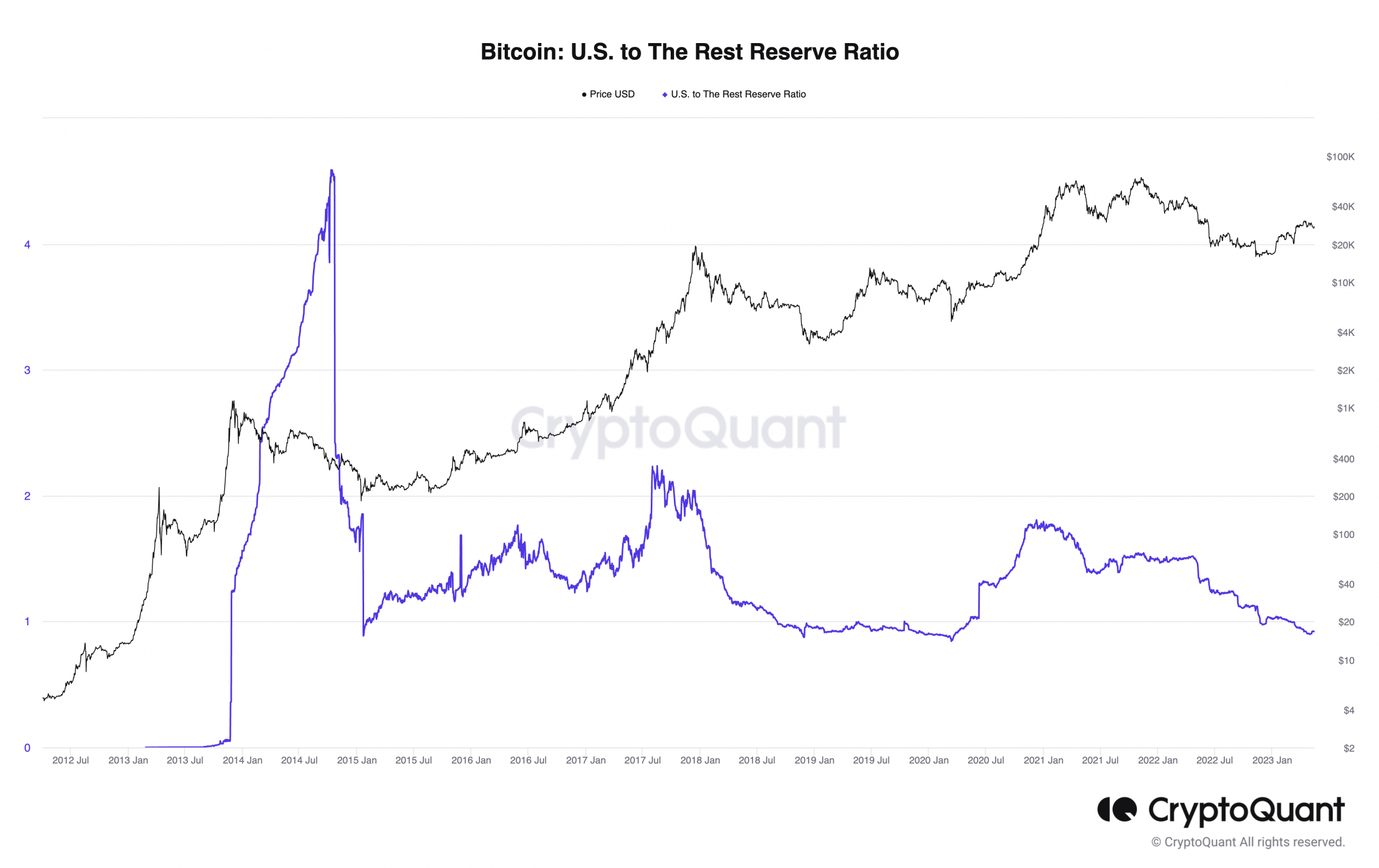 This has negatively impacted the Bitcoin U.S. to The Rest Reserve Ratio. The metric considers the country’s entities, including bank assets and exchange funds, in relation to the rest of the entity supply.