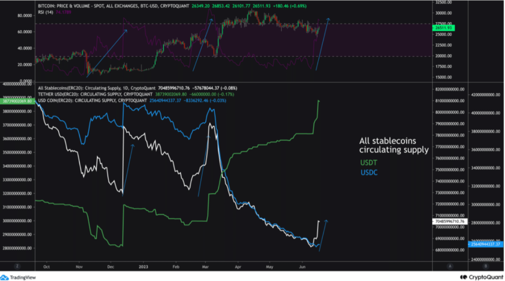 Recent events such as the SEC lawsuits and FOMC panic have caused price depreciation in cryptocurrencies. However, stablecoins could potentially have a positive impact on the price of BTC in the future, as observed from historical data.