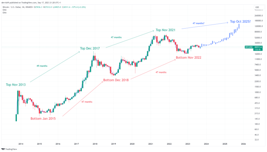 A specific pattern seems to occur when looking at previous tops and bottoms. The three previous bottoms, January 2015, December 2018, and November 2022, were all exactly 47 months apart. Similarly, the previous three tops, November 2013, December 2017, and November 2021, are either 49 or 47 months apart.