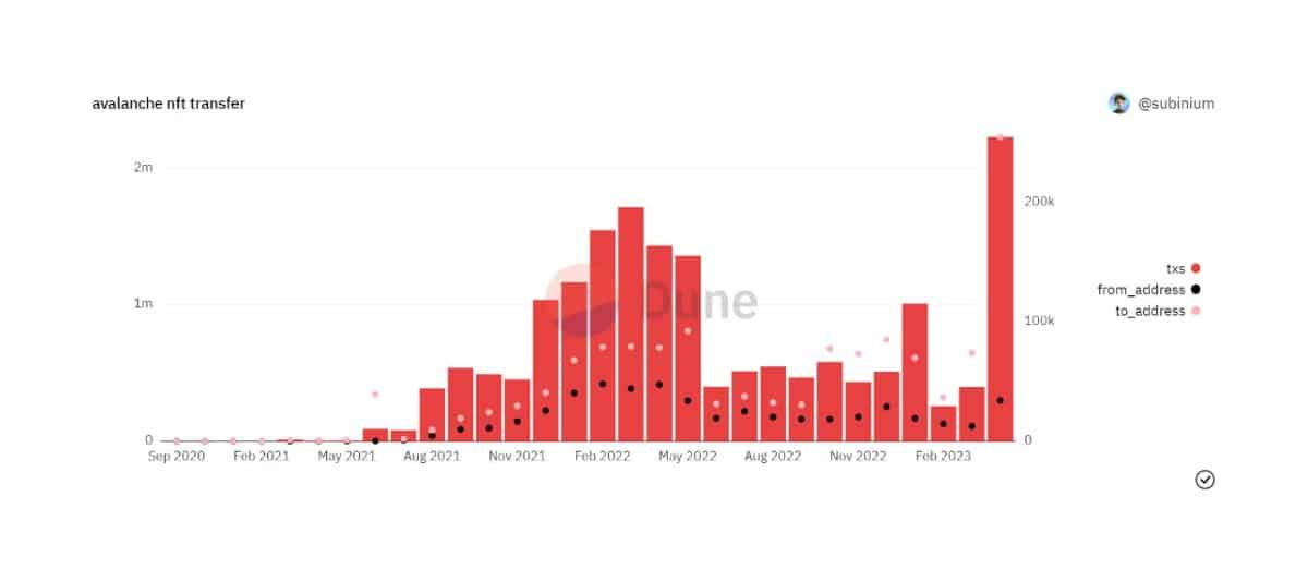 According to recent data, it was observed that Avalanche NFT transfers surged. During April, the Avalanche network experienced over 2 million NFT transfers, a figure that was five times greater than the previous month of March.