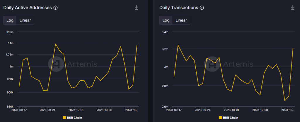 Binance’s network activity also registered an uptick of late, as Artemis’ data revealed that BNB’s Daily Active Addresses increased over the past few weeks. A similar increasing trend was also noted in terms of the blockchain’s Daily Transactions, which, after a dip, went up sharply.