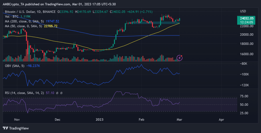 It was trading at about $23,900 as of this writing, with a value rise of approximately 3%. Also, on a daily timescale, the price range between $23,136 and $22,561 acted as its support area.
