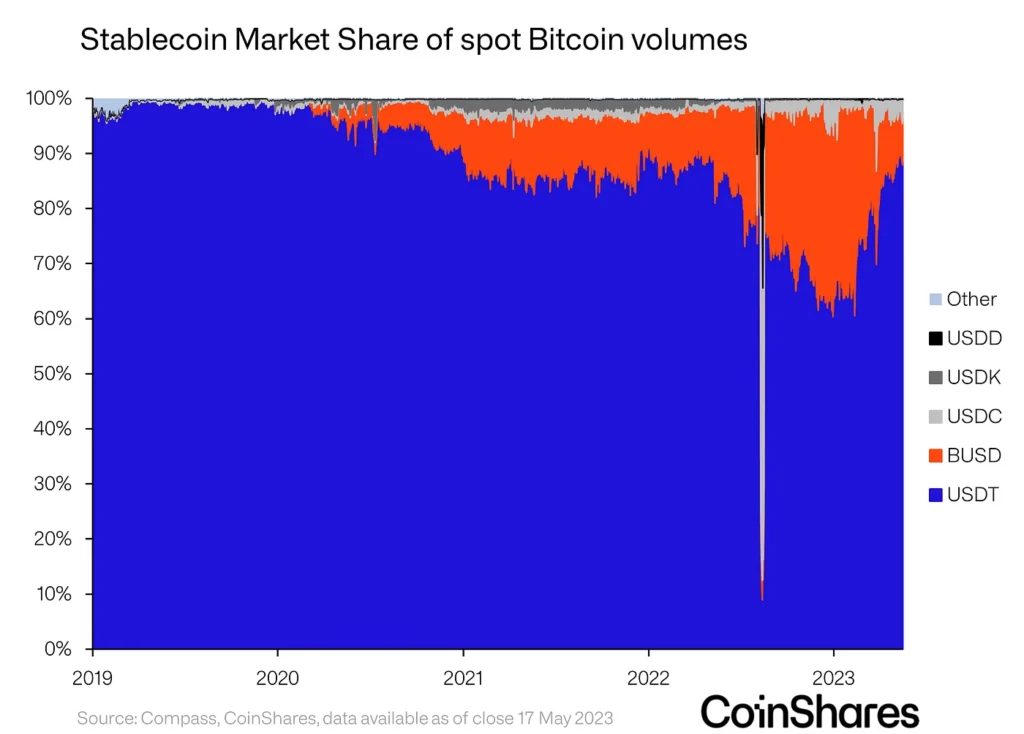 - Tether’s market share of BTC volumes recovered after taking a hit in 2022.