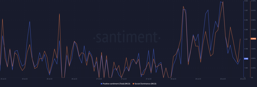 Positive sentiment around the coin also rose, suggesting investors’ confidence in WLD was high.