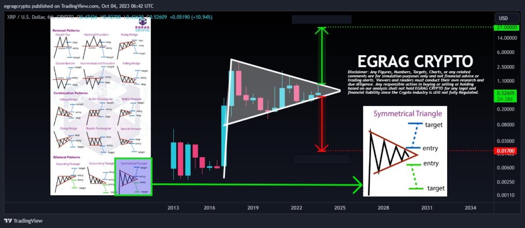On X (formerly Twitter), Egrag took a comprehensive look at the six-month chart of the XRP price, presenting two scenarios that couldn’t be more different: a crash to $0.017 and a rally to $27.