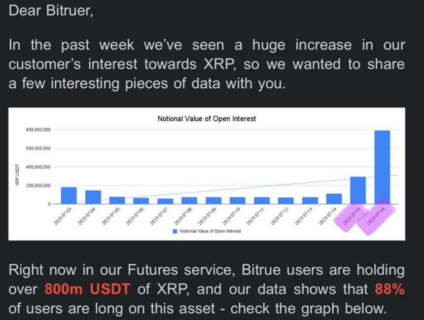 In the late hours of yesterday, a crypto analyst with the Twitter handle @cowboycrypto313 revealed that Bitrue had shared a report via email with its users, noting a massive increase in the notional value of the open interest of the XRP token.