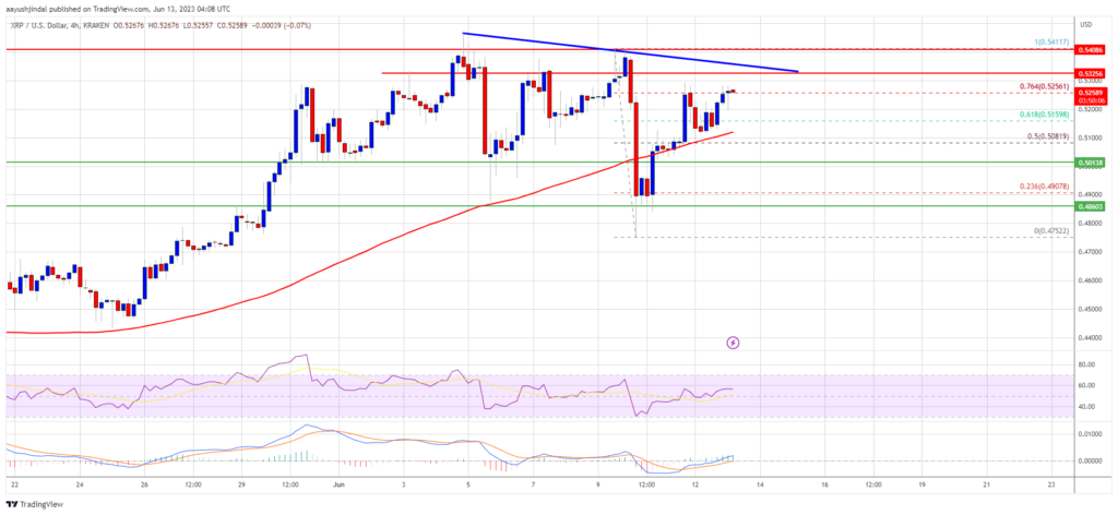XRP price is now trading above $0.515 and the 100 simple moving average (4 hours). It is testing the 76.4% Fib retracement level of the downward move from the $0.5411 swing high to the $0.4752 low.