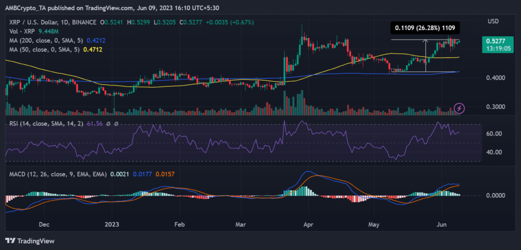 From 9 May to 9 June, the price trend tool revealed an upward trajectory, culminating in an impressive surge of over 26%. As of this writing, Ripple was trading at approximately $0.5, showcasing a modest but noteworthy increase of nearly 1%.